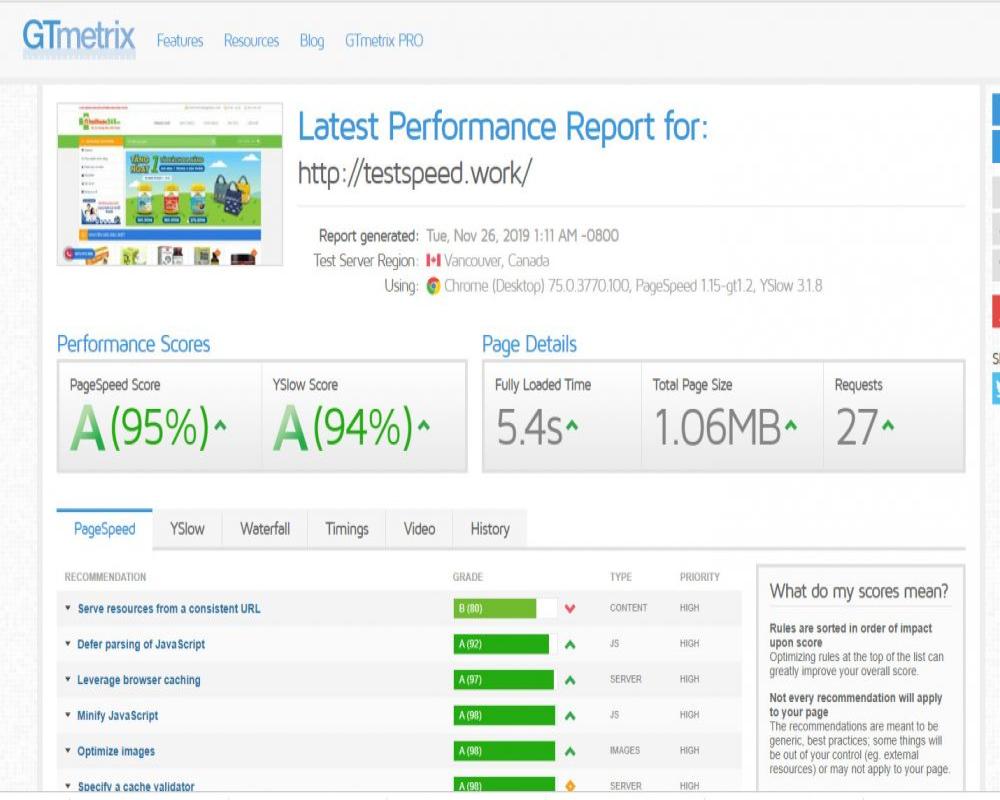 OKe như vậy là đã hoàn tất 3 bước.Lúc này bằng mắt thường, các bạn có thể thấy tốc độ tải trang của website đã cải thiện đáng kể. Các bạn tiến hành kiểm tra lại điểm Google PageSpeed Insights và GT Metrix để tận hưởng thành quả nhé ! Tùy từng thời điểm Test và tùy từng website mà số điểm này có thể xê dịch khác nhau. Theo cá nhân mình thì điểm GT Metrix phản ánh chính xác tốc độ website hơn là điểm Google Page Speed Insight .