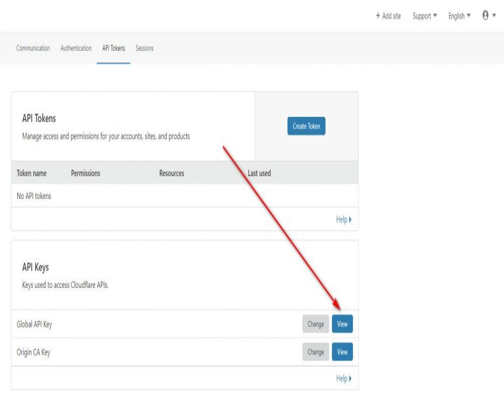 - Để lấy thông số GLOBAL API , các bạn đăng nhập vào CloudFlare, ở goc phải chọn My Profile, sau đó chọn Tab Api Tokens, ở mục Global API Key , chọn View: