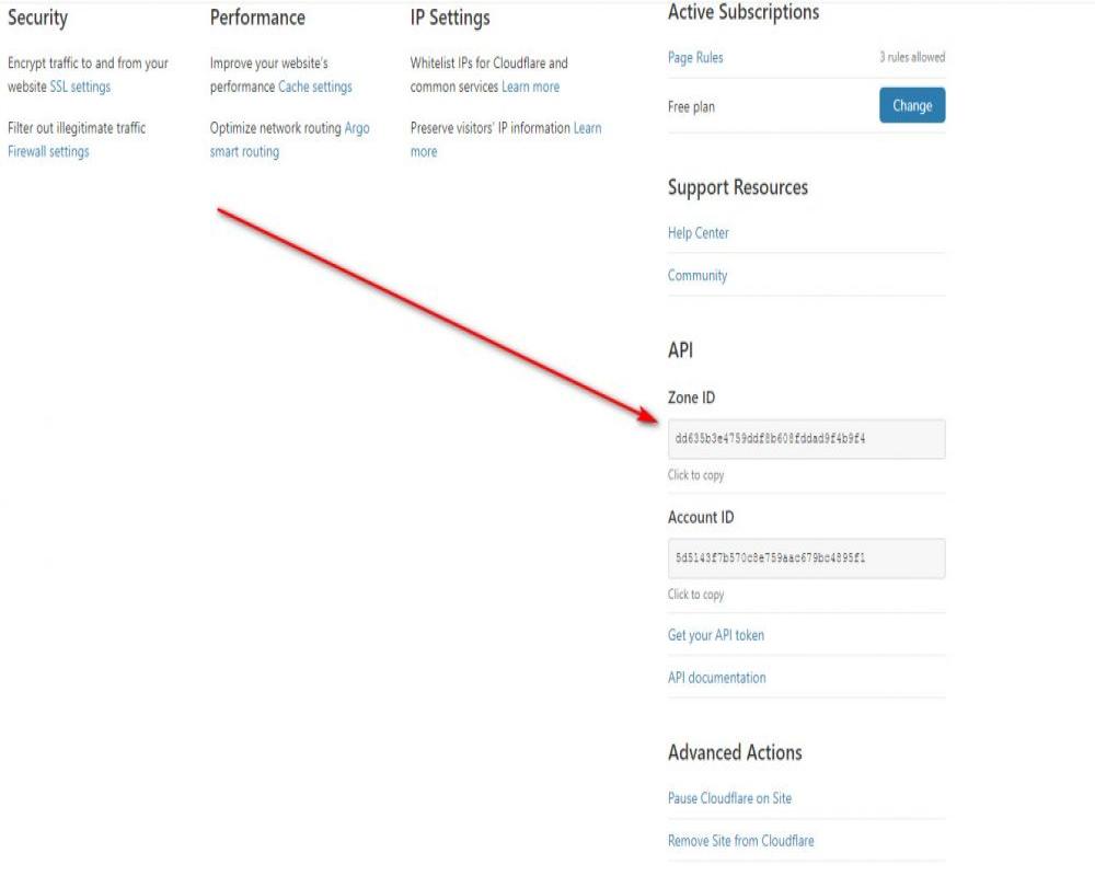 - Để lấy thông số Zone ID, các bạn vào CloudFlare, vào domain cần Setup, chọn Tab Overview, và kéo xuống bên dưới sẽ thấy Zone ID