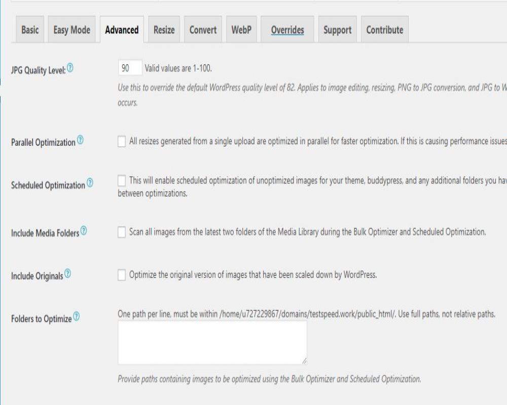 Hình ảnh là yếu tố góp phần không nhỏ trong việc tăng điểm Google Pagespeed Insights. Do đó , các bạn nên tối ưu hình ảnh trước khi up lên là tốt nhất. Các bạn tìm và cài đặt plugin EWWW Image Optimizer, sau đó vào Cài đặt – EWWW Image Optimizer để thiết lập các tùy chọn. Ở đây mình chỉ dùng 2 tùy chọn, đó là Advanced, cho chất lượng hình ảnh về 90% , và tùy chọn convert ảnh về WebP . Tùy theo từng yêu cầu cụ thể, các bạn có thể tham khảo thêm các chức năng Resize và Convert.
